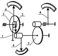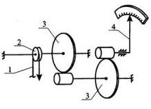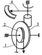 1 - нерастяжимая нить, 2 - рабочий шкив; 3 - рабочий диск; 4 - регистрирующая стрелка