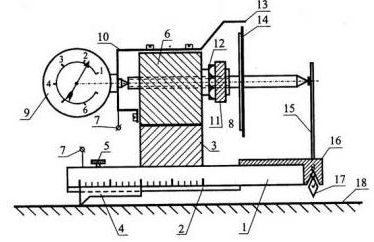 На противоположном конце основания имеется вилка 16. в гнездо которой входит подвижная призма 17. жестко соединенная с пером 15. В верхней части 7 стойки прибора находится муфта 11, через которую прохо­дит микрометрический винт 8 с укрепленным на нем лимбом 14. Конец винта, обращенного к перу, имеет форму конуса.