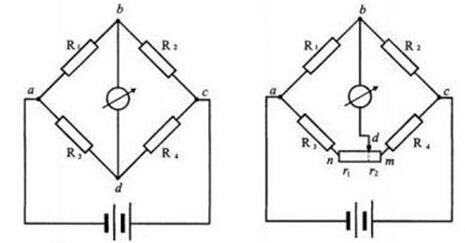 Во внешние плечи моста включены «рабочий» тензорезистор с со­противлением R1 воспринимающий наблюдаемые деформации, и «компен­сационный» тензорезистор с сопротивлением R2 = R1, помещаемый в оди­наковых с ним температурных условиях в непосредственной близости от рабочего, но не подверженный воздействию измеряемых деформаций. Во внутренние плечи включены тензорезисторы с сопротивлениями R3 и R4 , помещаемые в регистрирующем приборе и связанные с рабочим и компен­сационным тензорезисторами электропроводами. Как известно, мост будет сбалансирован (т.е. ток в его измерительной диагонали bd будет равен ну­лю) при условии