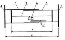 1 - испытываемая конструкция; 2 - натянутая стальная струна; 3 - опоры для крепления струны; 4 - жесткие диски; 5 - ограждающие трубки; 6 - электромаг­нит; 7 - соединительные провода; l - длина струны; L - расстояние между сред­ними сечениями дисков 4.