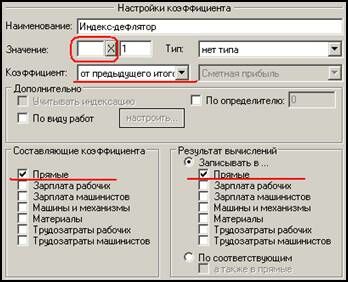 3. В открывшемся окне «Коэффициенты перехода в цены» нужно указать настройку данного коэффициента в соответствии с рис. 1.5.2. Обязательно нужно указать: от какой строки рассчитывается данный коэффициент (От предыдущего итого); составляющие коэффициента (коэффициент рассчитывается от всей стоимости, поэтому «Прямые ») и куда записывать результат вычислений (Прямые). Значение коэффициента ставим в соответствии с настройкой строки «Итого», которую нужно будет добавить после индекса-дефлятора. Например, индекс-дефлятор составляет «1,045». Если «Итого» с настройкой: «Вид итога» - «Стандартный»; «Тип итога» - «Включая предыдущее Итого», то значение индекса дефлятора нужно поставить на 1 меньше, т.е. «0,045». Если указать настройку строки «Итого»: «Вид итога» - «Стандартный»; «Тип итога» - «Не включая предыдущее «Итого», то значение индекса дефлятора нужно указать «0,045».