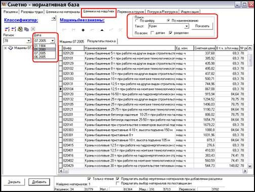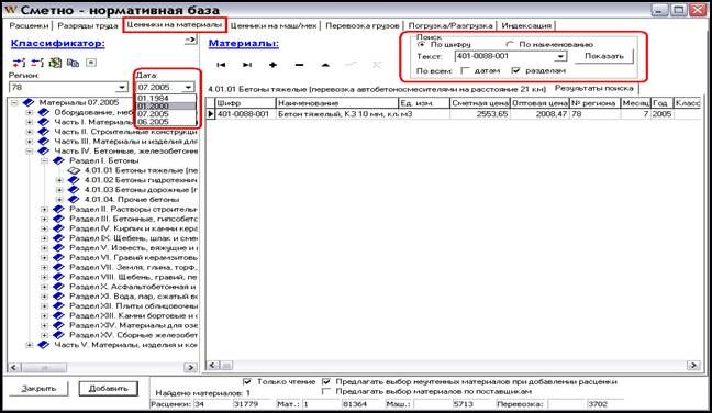 1. В этой вкладке можно найти материал по шифру или по наименованию аналогично поиску расценок.