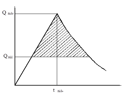 Объем регулирующего резервуара определяют, исходя из гидрографа стока (рис.24). максимальный расход Qрасч в трубопроводе перед регулирующим резервуаром будет возникать в момент времени tрасч , соответствующий продолжительности протекания воды от наиболее удаленной точке площади стока до регулирующего резервуара. Если после регулирующего резервуара расход воды равен Qрег , то рабочая емкость резервуара равна верхней части гидрографа, отсекаемой линией, параллельной оси абсцисс на уровне Qрасч . Если гидрограф стока ориентировочно принят за равнобедренный треугольник с основанием 2tрасч и высотой Qрасч , то объем регулирующего резервуара будет равен: