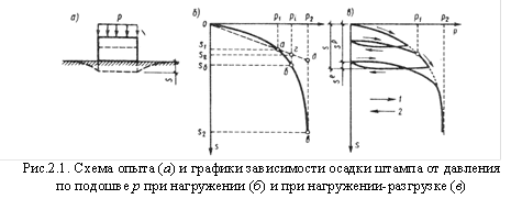 При нагружении и последующей разгрузки штампа общая осадка грунта может быть разделена на восстанавливающуюся (упругую)  и остаточную (пластическую)  (рис.2.1.в).