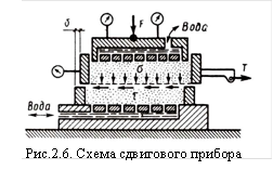 Сдвиговой прибор  (рис. 2.6.) позволяет при различных заданных нормальных напряжениях определить предельные сдвигающие напряжения, возникающие в момент разрушения образца грунта. Сдвиг (разрушение) образца грунта производится по фиксированной плоскости среза.