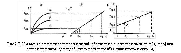 Уравнения (2.9) и (2.10) называют законом Кулона для сыпучих и связных грунтов: сопротивление грунтов сдвигу есть функция первой степени от нормального давления.