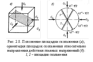 Теория Кулона-Мора рассматривает прочность грунта в условиях сложного напряженного состояния. Пусть к граням элементарного объема грунта приложены главные напряжения (рис. 2.8, а). При постепенном увеличении напряжения  и постоянной величине напряжения  произойдет сдвиг по некоторой площадке, наклоненной к горизонтальной плоскости, причем промежуточное главное напряжение  будет действовать параллельно этой площадке, никак не влияя на сопротивление грунта сдвигу.