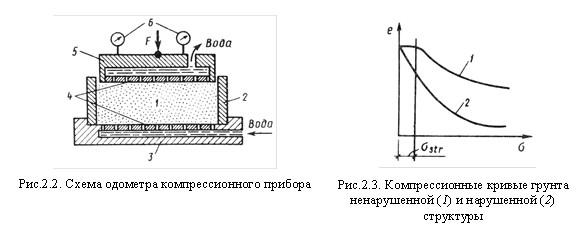 Компрессией называется одноосное сжатие образца грунта вертикальной нагрузкой при условии отсутствия его бокового расширения. Испытания проводят в компрессионном приборе – одометре (рис. 2.2.).