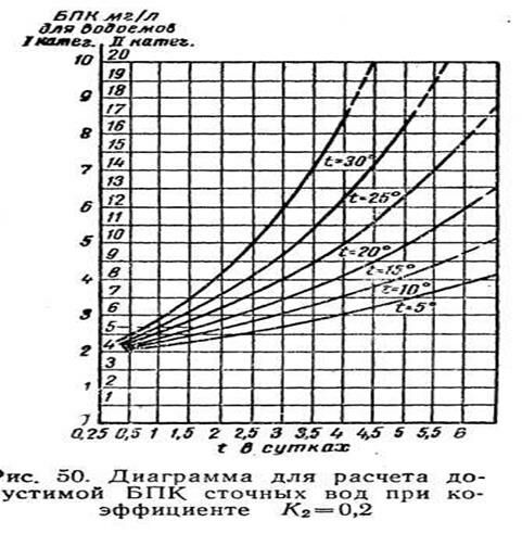 Чтобы определить допустимую величину БПК5 сточных вод Lсм5 , т. е. ту степень, до которой они должны быть очищены до спуска в водоем, используется уравнение , а с учетом коэффициента а:
