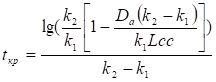 Уравнения при известных величинах констант потребления кислорода k1 и растворения кислорода k2, а также известных величинах дефицита кислорода Da и Dt дают возможность определить tKp и LCM. Уравнения эти обычно решаются подбором. Задаются значениями LCM и по формуле определяют Lкр; по полученному значению tKp по формуле находят значение LCM. Если эта величина сильно отличается от заданной, то уравнение решается повторно до достижения величины LCM, равной заданной.