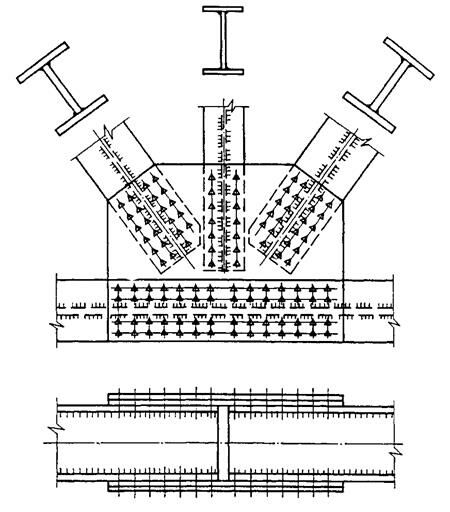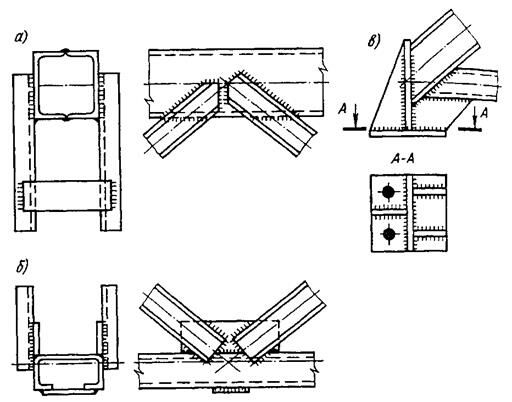 При поясе фемы коробчатого сечения и раскосах из двух ветвей, соединенных планками, раскосы примыкают с двух сторон внахлестку к поясу и привариваются фланговыми швами (рис.9.25,а). Если высота пояса недостаточна, то к нему приваривают фасонки в двух плоскостях стыковыми швами (рис.9.25,б). Опорный узел показан на рис.9.25,в.