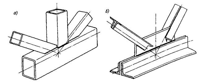 Фермы из гнутых сварных замкнутых профилей (ГСП) проектируют с бесфасоночными узлами (рис.9.25). Для упрощения конструкции узлов следует принимать треугольную решетку без дополнительных стоек, при которой к поясам примыкает не более двух элементов.
