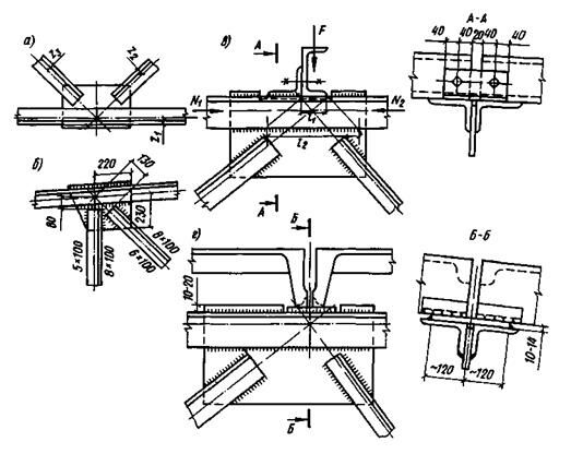 а – узел без фасонки; б – узел с дополнительной фасонкой и изменением сечения пояса встык; в – узел с изменением сечения пояса с помощью накладки и вставки; г – узел фермы с перекрестной решеткой из уголков