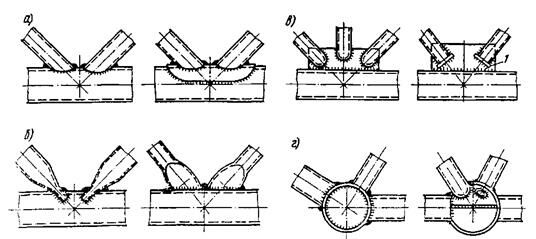 Если нет станков для фигурной обработки торцов труб, узлы трубчатых ферм можно сплющивать (рис.9.22,б), а в исключительных случаях выполнять на фасонках (рис.9.22,в). Сплющивание концов допустимо лишь для труб из низкоуглеродистой или другой пластичной стали.