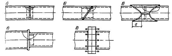 Стыковое соединение можно также выполнить с помощью парных кольцевых накладок, гнутых из листа или вырезаемых из труб того же или несколько большего диаметра (рис.9.23,в). Толщину накладок и сварного шва рекомендуется принимать на 20% больше толщины стыкуемых труб.