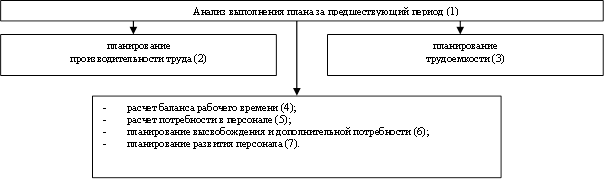 Рассмотрим технологический процесс планирования труда и численности работающих. Технологический процесс планирования труда и численности представляет собой последовательность взаимосвязанных процедур, которые имеют определенный набор исходных данных, алгоритм расчета показателей и законченный результат (рис. 2), в процессе планирования выполняются следующие плановые расчеты: