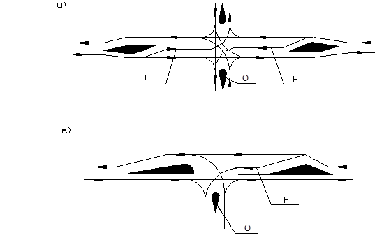 Рис. 3.3. Схема канализированного пересечения (а) и примыкания (б) с накопительными полосами (Н): 1 – траектория движения автомобиля  (ось полосы движения);