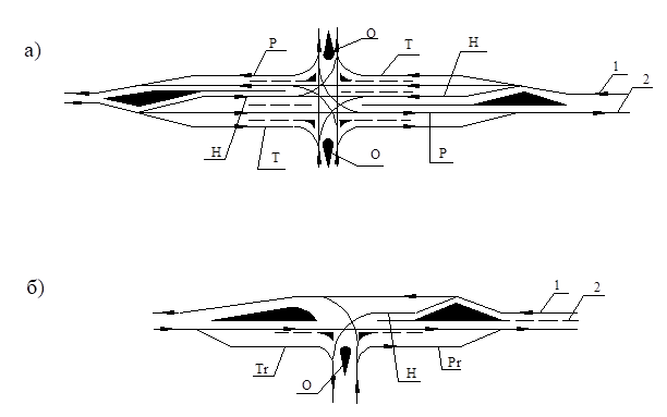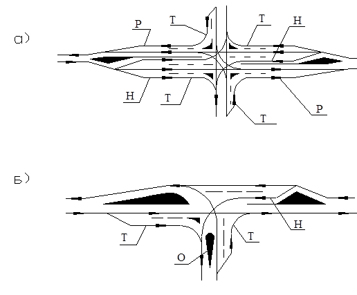 Рис. 3.4. Схемы канализированных пересечений (а), примыканий (б) с накопительными полосами (Н), полосами торможения (Т), разгона (Р) на главной автомобильной дороге: 1 – траектория движения автомобиля (ось полосы движения); 2 – ось автомобильной дороги;  3 – каплевидный направляющий островок; 4 – островок с зоной безопасности; 5 – треугольный направляющий островок.