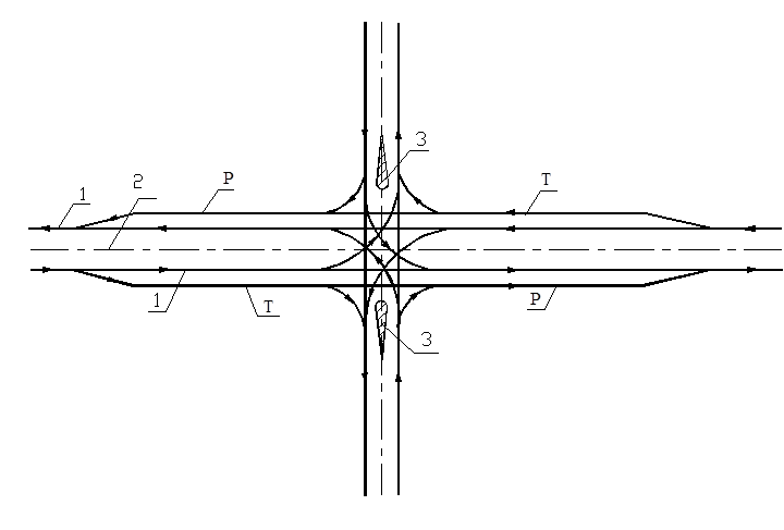 Рис. 3.6. Схема канализированного пересечения автомобильных дорог при наличии полос торможения (Т) и разгона (Р) 1 – траектория движения автомобиля (ось полосы движения);