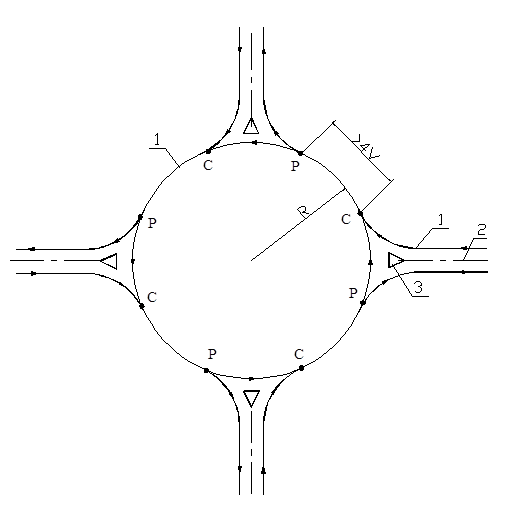Рис. 3.7. Схема кольцевого пересечения автомобильных дорог: 1 – траектория движения автомобиля; 2 – ось автомобильной дороги;  3 – треугольный направляющий островок;