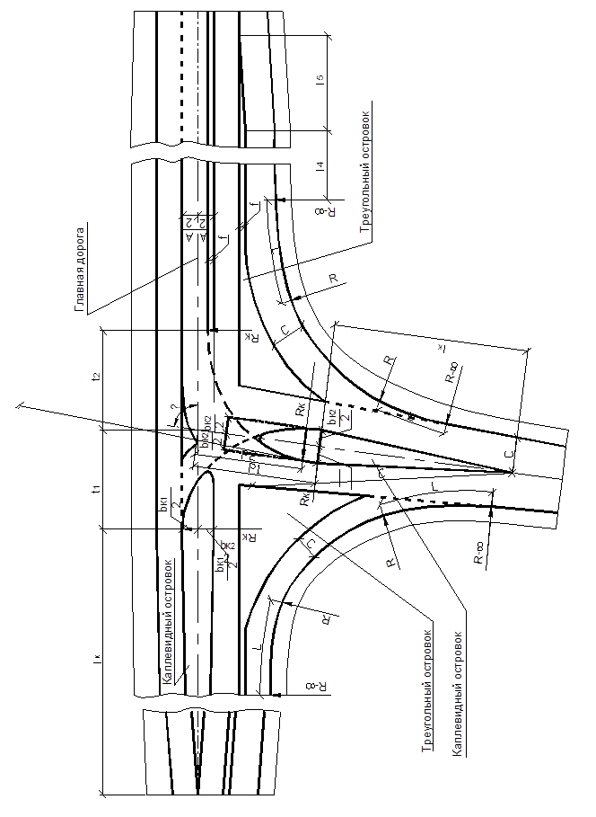 На канализированном примыкании проектирование каплевидных островков на второстепенной дороге и треугольных островков аналогично пересечению дорог и приведено на рисунке 4.1.9. Величина параметров для разбивки элементов канализированного примыкания приведена в таблице 4.6.