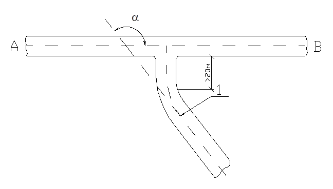 Для обеспечения просматриваемости пересечений или примыканий рекомендуется их выполнять под прямым углом или в исключительных случаях близким к нему в пределах 50о ≤ α ≤ 100о . При пересечении дорог под углом 50о ≤ α ≤ 120о рекомендуется корректировать план трассы второстепенной дороги в зоне пересечения или примыкания таким образом, чтобы на расстоянии не менее 20 м ось второстепенной дороги была прямой, перпендикулярной оси главной дороги (рис. 4.5).