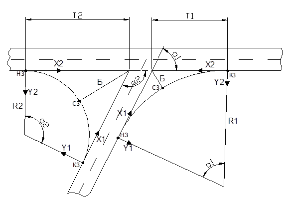 Для детальной разбивки очертания сопряжения кромок проезжей части по круговым кривым используют прямоугольные системы координат X1Y1 до середины кривой и X2Y2 после середины.