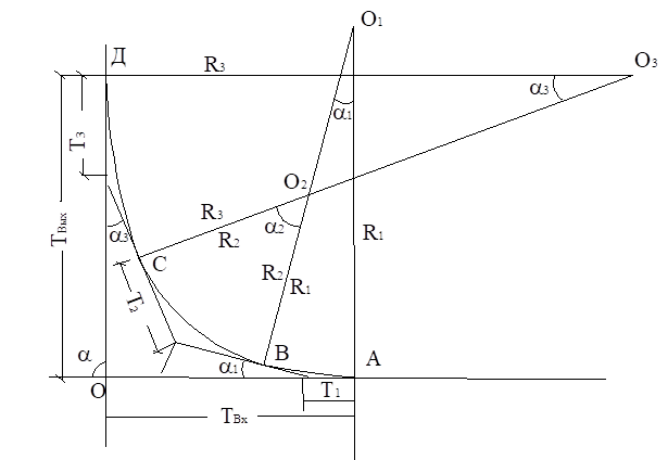 Коробовая кривая состоит из трех круговых кривых (рис. 4.9): входной АВ с радиусом поворота R1 = 2R и центральным углом α1 = 15о; средней ВС радиусом R и выходное СД с радиусом R2 = 3R и центральным углом α2 = 20о.