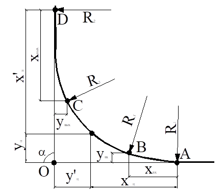 По значениям тангенсов Твх и Твых получаем положение начала (точка А) и конца (точка Д) коробовой кривой. Координаты конца входной кривой (точка В) и выходной кривой (точка С) получим по формулам (4.3).