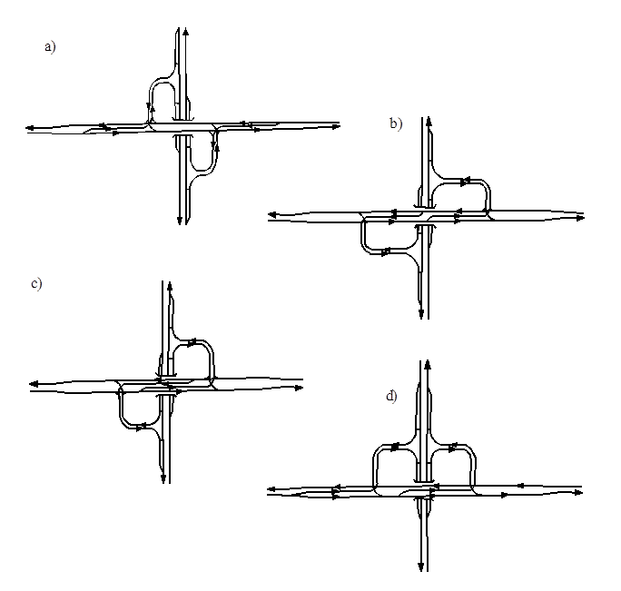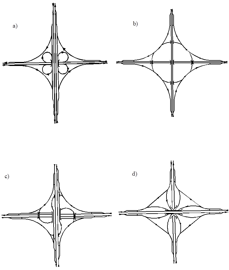 Рис. 5.1. Схемы полных транспортных развязок четырех направлений на пересечениях автомобильных дорог: а – «клеверный лист»; b – распределительное кольцо с пятью путепроводами; с – турбинный тип; d – четырехъярусное пересечение.