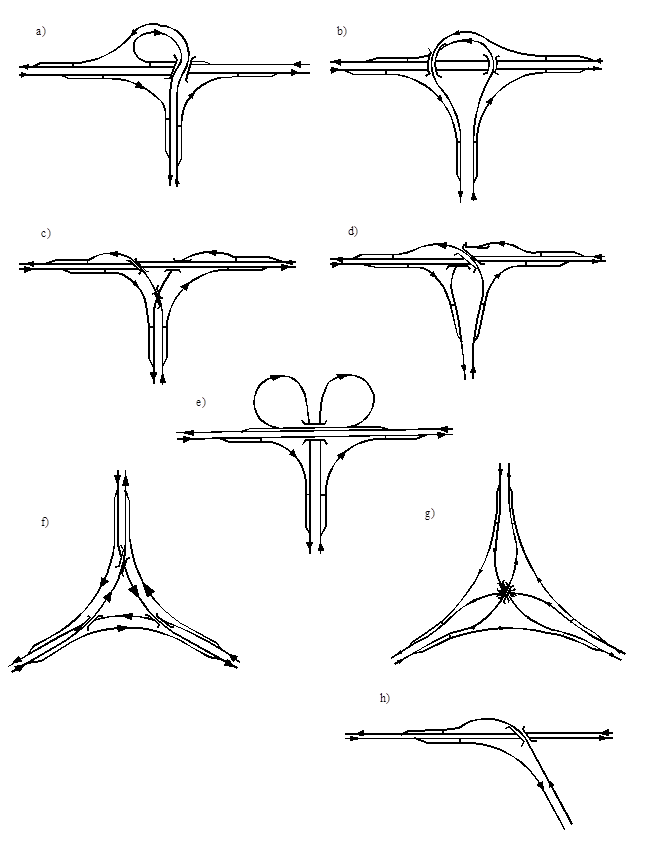 Рис. 5.2. Схемы транспортных развязок трех направлений  автомобильных дорог: а – примыкание по типу «труба»;  b – грушевидное примыкание; с, d – примыкание с полупрямыми левоповоротными съездами; е – листовидное примыкание; f – примыкание по типу треугольника; g – трехъярусное примыкание; h – разветвление.