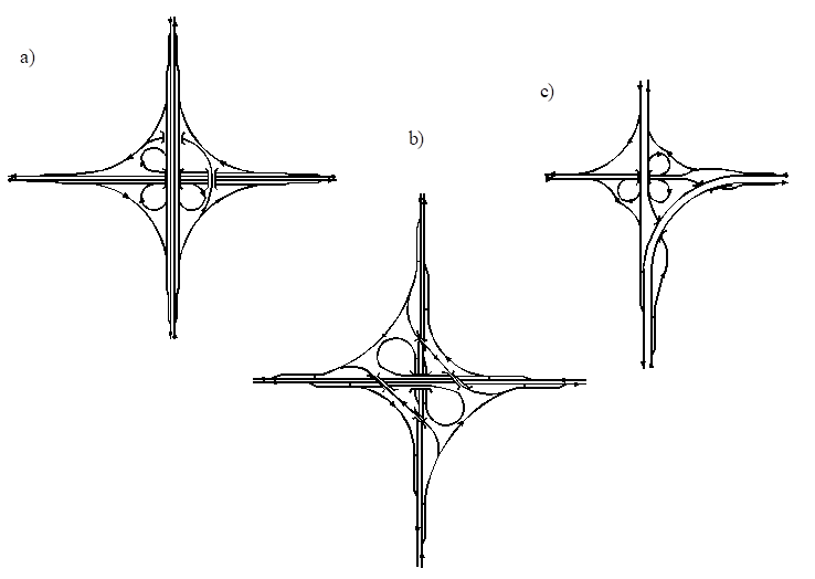 Рис. 5.3. Схемы сложных транспортных развязок на основе развязки «клеверный лист» с улучшенными условиями движения на левых поворотах одного (а, с) и двух (b) направлений