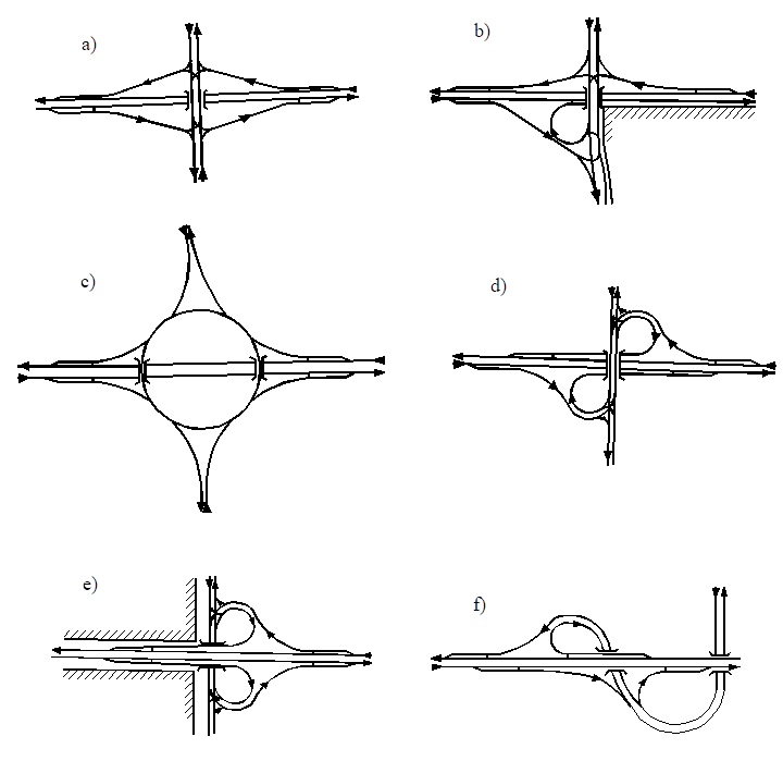Основные типы транспортных развязок четырех направлений дорог приведены на рис. 5.1, трех направлений на рис. 5.2.