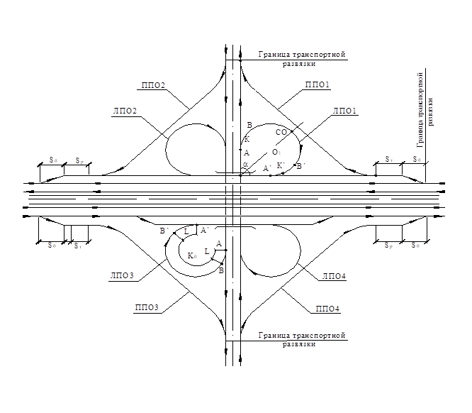Транспортная развязка «полный клеверный лист» включает (рис. 8.1) проезжие части и земляное полотно пересекающихся дорог, путепровод, левоповоротные соединительные ответвления (ЛПО), правоповоротные соединительные ответвления (ППО), полосы торможения и разгона длиной Sт и Sр с отгоном уширения длиной Sо.