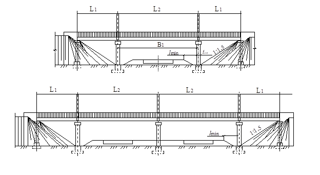 Рис. 8.2. Схемы балочных трехпролетных и четырехпролетных путепроводов