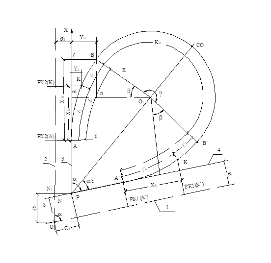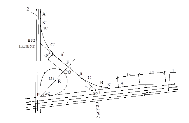 Рис. 8.7. Схема к проектированию плана правоповоротного соединительного ответвления: