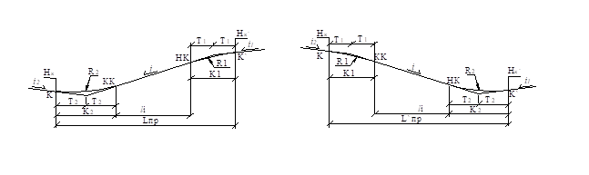 Длина переходной кривой назначается исходя из обеспечения перехода от уклона iп в точке К до уклона iв в точке В. Методика определения требуемой длины переходной кривой изложена в § 7.