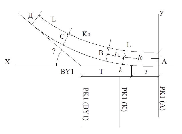 Рис. 8.3. Схема к расчету элементов левоповоротного соединительного ответвления (ЛПО)