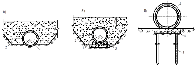 При укладке трубопроводов в водонасыщенных грунтах устраивают искусственное песчано-гравийное, щебеночное или бетонное основание. Основание под трубы в скальных грунтах необходимо выравнивать слоем песка или мягкого уплотненного грунта высотой не менее 0,1м над выступающими неровностями дна траншеи.