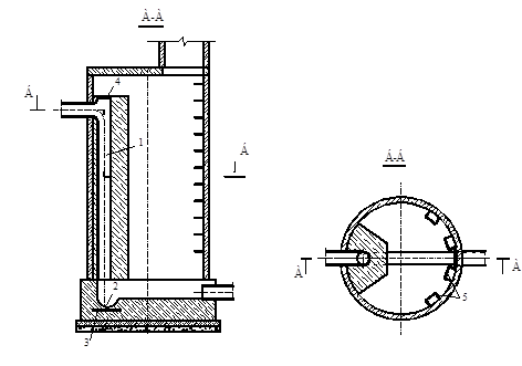 1.Стояк; 2.Водобойная подушка; 3.Металлическая плита; 4.Приемная воронка; 5.Скобы.