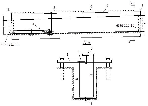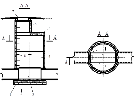 1.Щебеночная подготовка; 2.Плита днища; 3.Лотковая часть; 4.Рабочая камера; 5.Плита перекрытия; 6.Горловина; 7.Люк; 8.Скобы.