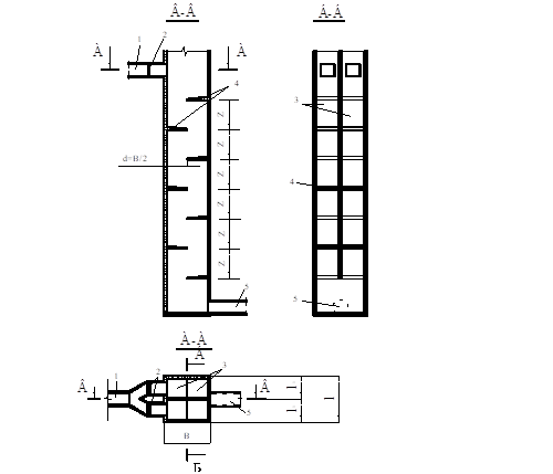1.Подводящий коллектор; 2.Шибер; 3.Секции перепадного колодца; 4.Ступени перепада; 5.Отводящий коллектор.