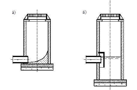 На трубопроводах диаметром до 500мм включительно и высотой перепада не более 6,0м применяются перепадные колодцы со стояком в колодце (рис.31). диаметр стояка принимается равный диаметру подводящего трубопровода. В верхней части стояка устраивается приемная воронка, под стояком водобойная подушка, под ней металлическая плита. Для стояка диаметром до 300мм допускается вместо водобойной подушки устанавливать направляющее колено с водобойной стенкой.