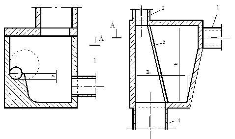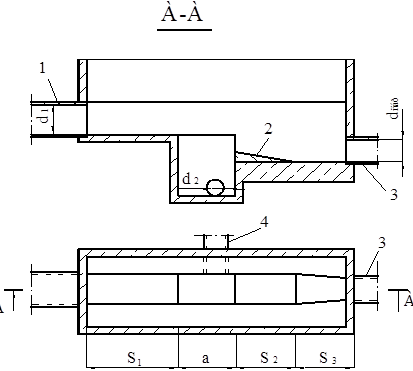 1.Подводящий трубопровод; 2.Порог; 3.Ливнеотвод (сбросной трубопровод); 4.Отводящий трубопровод.