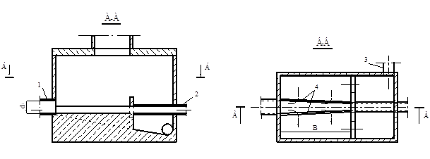 1.Футляр; 2.Самотечный трубопровод; 3.4.Контуры котлована для строительства соответственно приемного и рабочего.