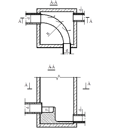 смотровой колодец, установленный на повороте трассы трубопровода, называется поворотным, на присоединениях к ним боковых веток - узловым. Их конструкции аналогичны конструкции линейного с тем отличием, что диаметр рабочей камеры определяется из условия размещения внутри колодца кривых поворотов. Радиус поворота оси лотка в колодце должен быть не менее диаметра трубопровода. Лотки присоединений боковых веток в узловых колодцах также выполняются криволинейными с таким же радиусом поворота в направлении течения сточной жидкости (рис.30). на крупных коллекторах диаметром 1200 и более радиус поворота должен быть не менее пяти диаметров, а смотровые колодцы предусматривают в начале и в конце кривой поворота.
