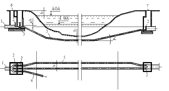 1.Подводящий трубопровод; 2.Порог водослива; 3.Сбросной трубопровод (ливнеспуск); 4.Отводящий трубопровод.