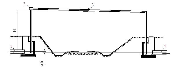 1.Подводящий трубопровод; 2.Вакуум-насос; 3.Труба сифона; 4.Отводящий трубопровод.