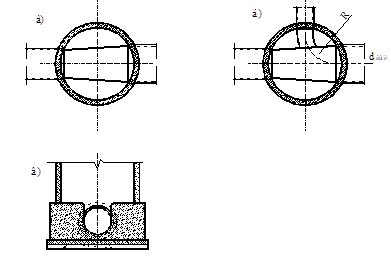 если грунт основания имеет нормальное сопротивление 0,1-0,15МПа, то керамические и асбестоцементные трубы укладывают на монолитное бетонное основание, спрофилированное по форме трубы с углом охвата 900 (рис.27б).