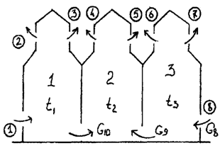 расчета заключается в том, что во внутренний пролет воздух может поступать только из крайних пролетов. Загрязненный воздух удаляется из всех пролетов через фрамуги аэрационных фонарей. Часть воздуха поступившего в 1 и 3 пролеты будет поступать во 2 пролет, следовательно, приточный воздух поступивший во 2 пролет отличается параметрами от воздуха 1 и 3 пролетов, т.к. он ассимилирует часть теплоизбытков.